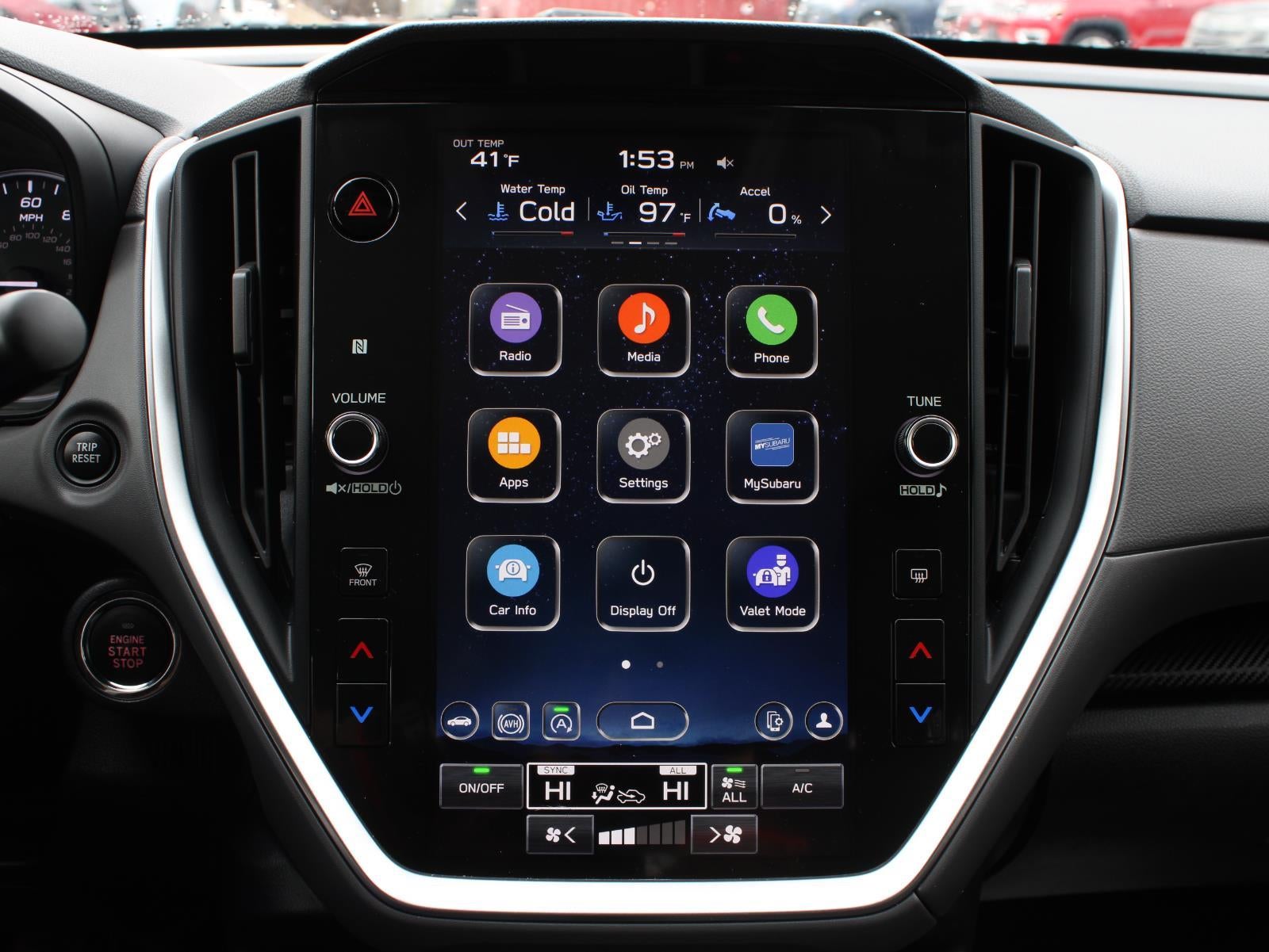 - Radio: Subaru STARLINK 11.6" Multimedia Plus Sys -inc: AM/FM stereo, HD Radio, multi-touch gesture high resolution display screen, voice activated controls, Bluetooth® audio streaming and hands-free phone connectivity, Bluetooth® hands-free SMS text messaging connectivity, iPod control capability, SiriusXM All Access Radio (4 months free trial included/subscription required after), SiriusXM Travel Link (4 months free trial included/subscription required after), smartphone integration: Android Auto and Apple CarPlay w/full screen view and wireless connection, USB and Over The Air (OTA) audio system update, steering wheel audio system and Bluetooth® control switches, 6 speakers (2 dash panel tweeter, 2 front door and 2 rear door), illuminated 3.5mm auxiliary input jack, illuminated front USB A and C input/charge ports and illuminated rear USB A and C charge ports